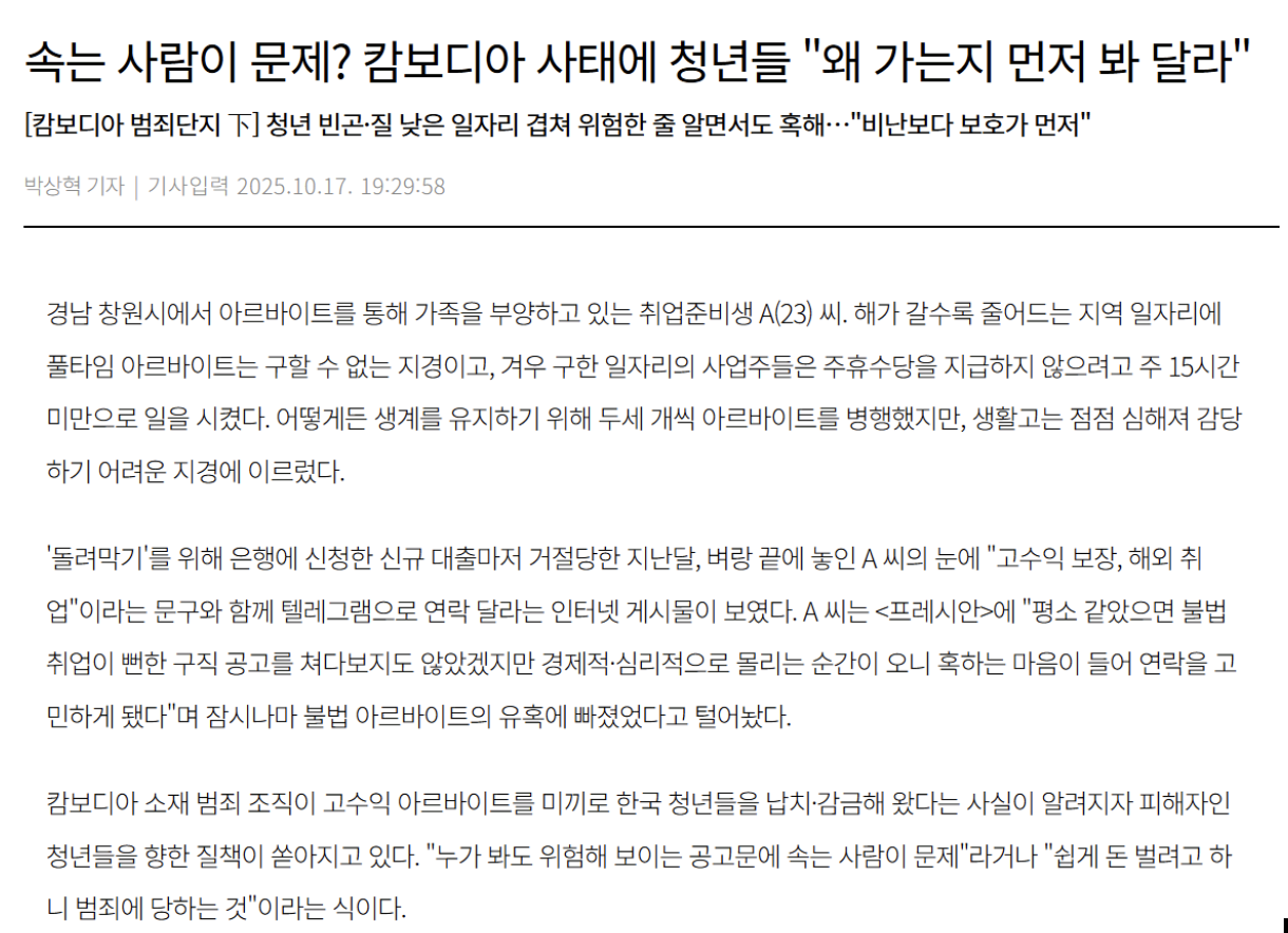 이런 현실을 알고 나면 청년들이 이런 ‘위험한 선택🕹️’을 한 것을 쉽게 비난할 수 없어. 우리 사회가 양질의 일자리💼를 청년들에게 더 많이 제공했다면, 이들의 캄보디아행✈️과 그곳에서 벌어진 범죄로 인한 또 다른 피해자🤕 양산을 막을 수 있었을지도 몰라.